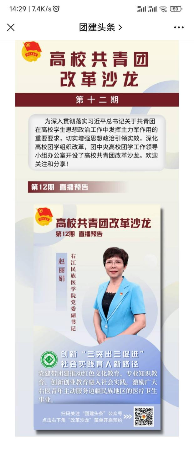 2023年8月23日下午,必赢官网党委副书记赵丽娟在共青团改革沙龙平台上分享学校共青团改革经验,全国团干和青年学生们通过“团建头条”公众号观看直播。