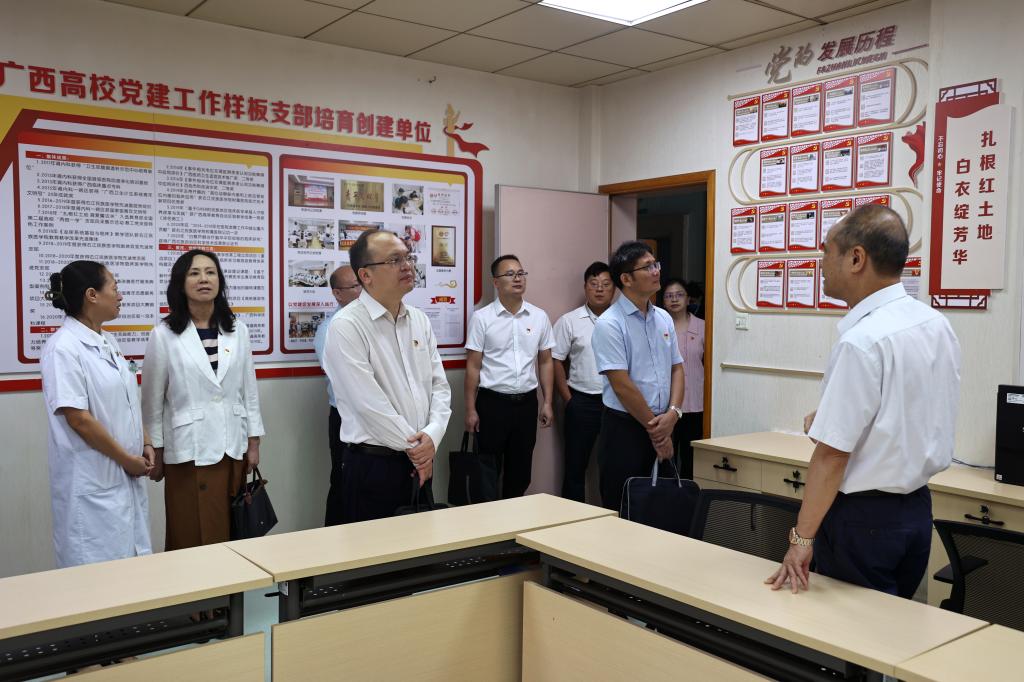 10月9日上午,自治区党委教育工委首批新时代广西高校党建“双创”工作验收第一小组组长、桂林理工大学党委常委、组织部部长唐壮东,南宁师范大学自然资源与测绘学院党委书记、党委组织部副部长黎先,广西工业职业技术学院党委组织部副部长张敏一行3人,对必赢官网入选首批新时代广西高校党建“双创”培育创建单位——护理学院党委、机关党委组织统战党支部、医学影像学院学生第一党支部、临床医学院(附属医院)肾内科党支部等“标杆院系”和“样板支部”建设情况进行实地验收。学校党委书记邓砚,党委组织部和各培育创建单位负责同志参加有关工作。