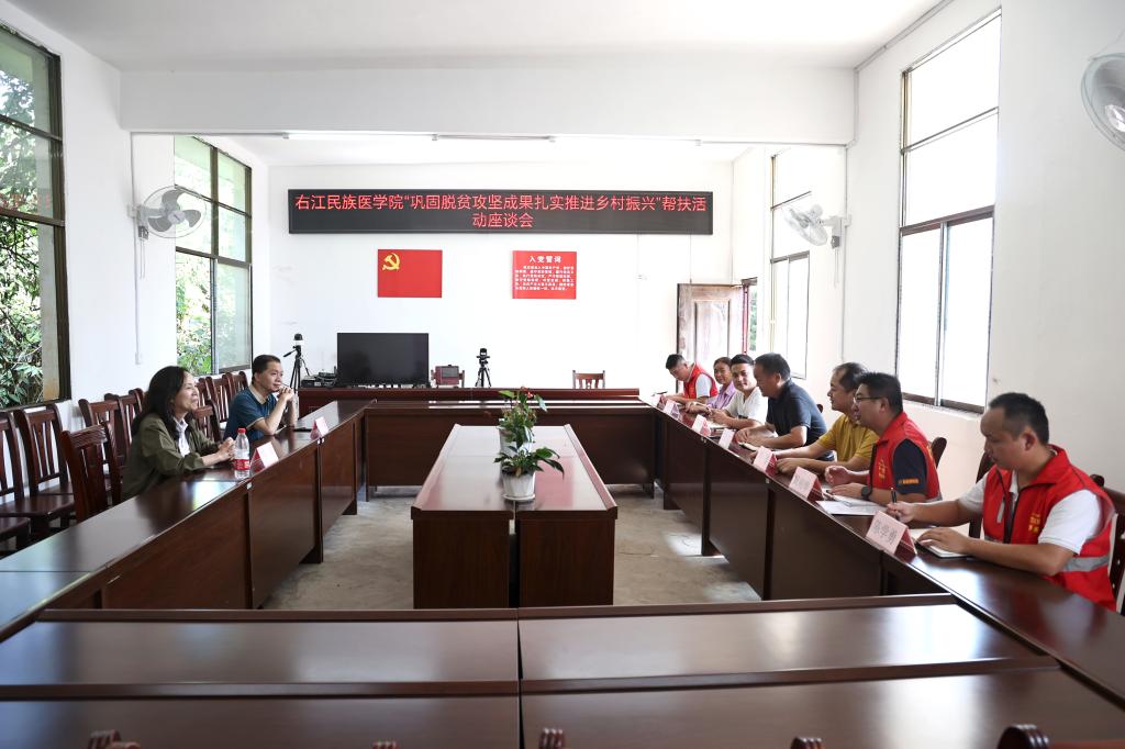 10月18日,必赢官网到西林县开展“巩固脱贫攻坚成果 扎实推进乡村振兴”帮扶活动。图为党委书记邓砚与驻村工作队和普合苗族乡、岩腊村“两委”同志进行了座谈交流。