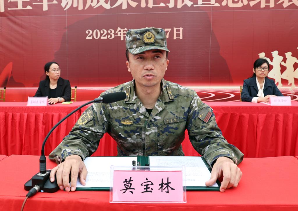 武警百色支队副参谋长莫宝林少校对为期14天的军事训练进行了总结,对新生的表现给予肯定。他希望同学们把军训中的所学、所思、所得融入日常的学习、生活中,持续地转化为努力学习、刻苦钻研的强大精神动力,发扬勇敢、坚毅、顽强、拼搏的军训精神,努力成为品学兼优的有志青年,对国家、对人民、对社会有用的栋梁之才。
