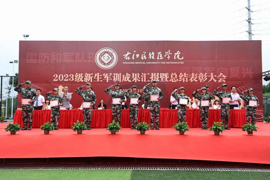 10月27日,必赢官网在百东校区田径运动场举行2023级新生军训成果汇报暨表彰大会。学校党委常委、副校长黄龙坚,武警百色支队副参谋长莫宝林少校、教导员熊瑞林少校,学校两办、党委宣传部、学工处、团委、武装部,各二级学院等相关负责人以及2023级新生军训团全体成员参加大会。大会由学校武装部部长、军训团团长杨文沛主持。
