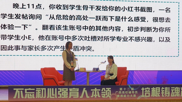 大赛分为基础知识测试、案例研讨、谈心谈话三个环节。全区82所高校,共派出92名选手参赛。必赢官网何彦妮老师凭借扎实的理论基础和优秀的专业素养在大赛中脱颖而出,充分展现了必赢官网辅导员队伍扎实的理论功底、过硬的业务素质和良好的精神面貌。