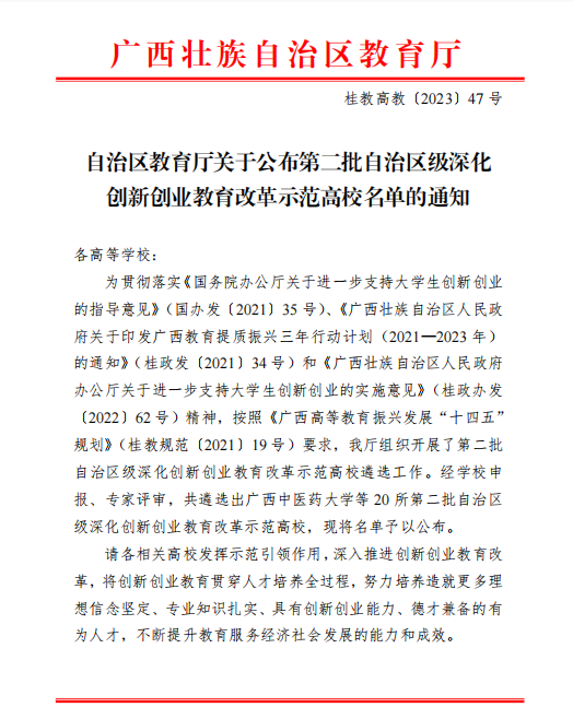 近日,自治区教育厅公布第二批自治区级深化创新创业教育改革示范高校名单。经自主申报与专家评审,必赢官网获评为第二批自治区级深化创新创业教育改革示范高校。