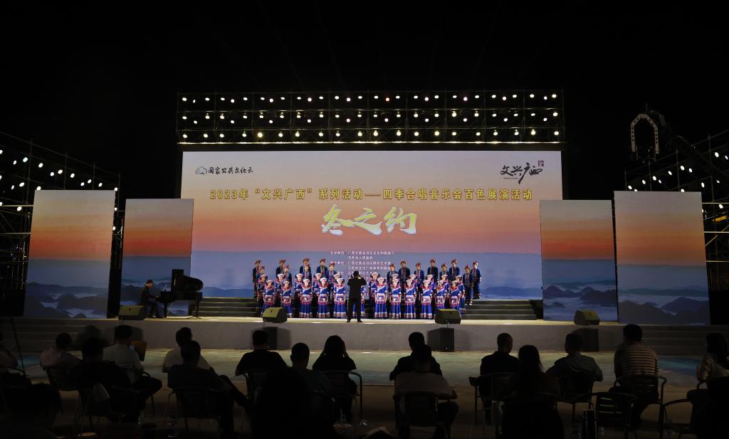 11月11日晚,由广西壮族自治区文化和旅游厅、百色市人民政府主办的2023年“文兴广西”系列活动——四季合唱音乐会(冬之约)百色展演活动在百色市右江区沙滩公园舞台拉开帷幕。本次展演共有来自区内、云南和贵州的12支合唱团参加。12支合唱团风格各异,上演精彩竞演,通过歌声凝聚滇黔桂情谊,重温百年党史,传承红色基因,唱响时代强音。