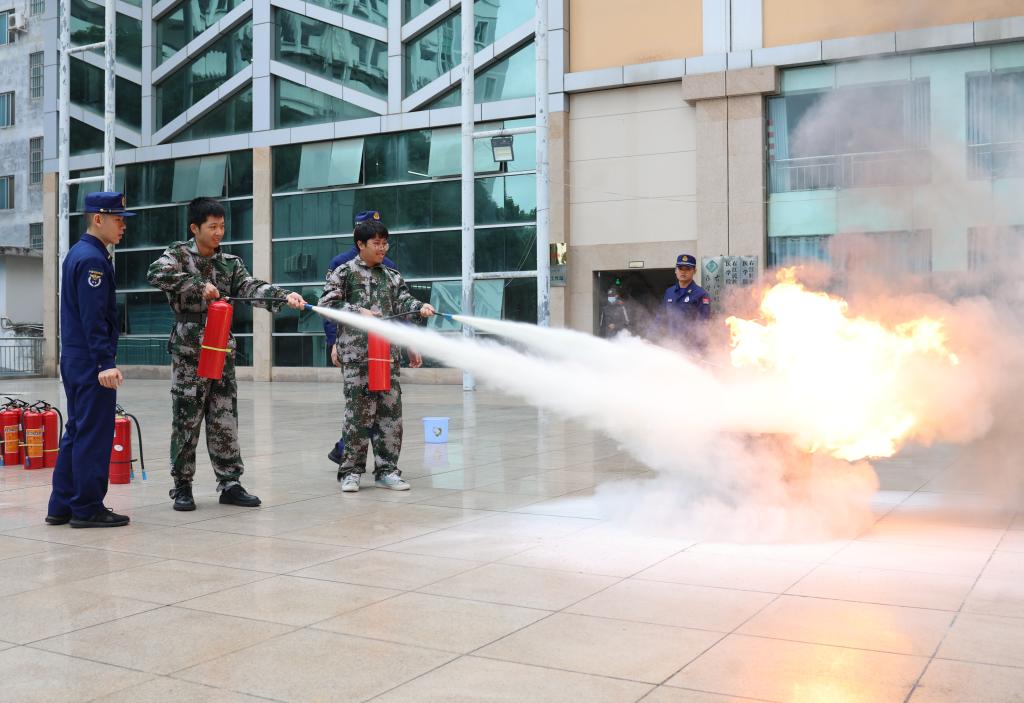 学生在消防员的指导下使用灭火器灭火。