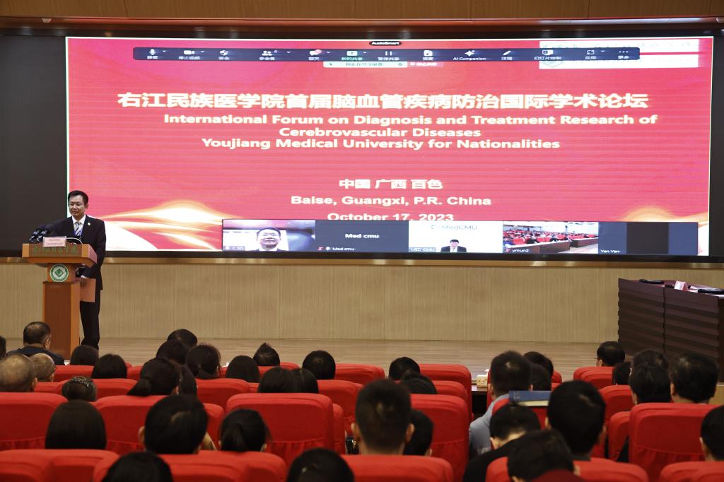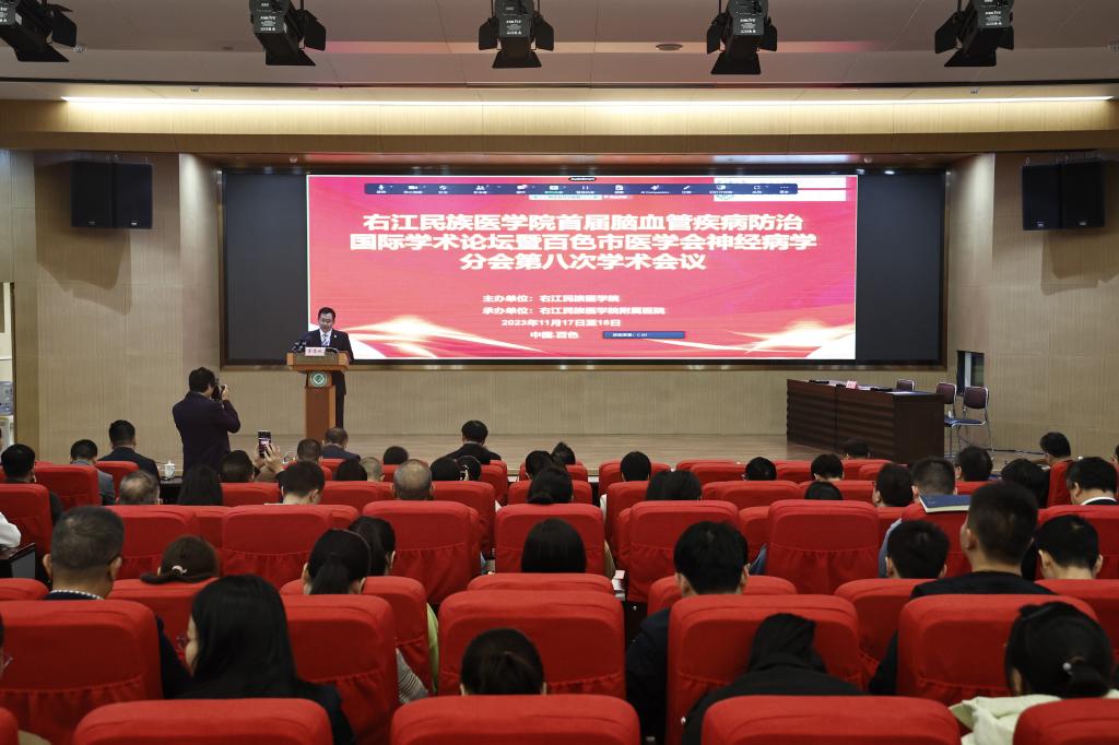 孟冬时节逢盛会,右江河畔喜迎宾。11月17日,必赢242net官网首届脑血管疾病防治国际学术论坛暨百色市医学会神经病学分会第八次学术会议在必赢官网国际会议中心举行,学校党委副书记、校长李雪斌,学校党委常委、副校长谭盛葵,百色市卫生健康委员会副主任张军,泰国清迈大学医学院院长班纳吉·隆佳纳披瓦出席会议并致辞。来自美国、泰国、日本、广州、重庆、湖南等国内以及区内知名专家做线上和线下的专题学术讲座和病例分享。会议由学校科技处处长黄忠仕主持。