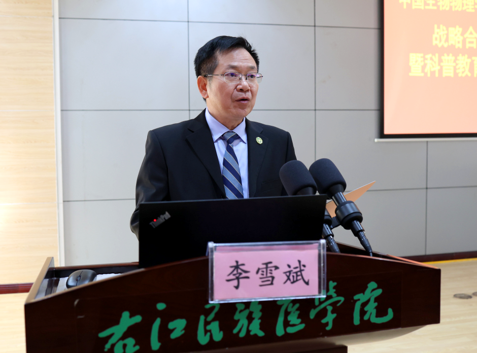 李雪斌校长在致辞时首先代表全校师生员工,向各位领导专家的到来表示热烈的欢迎,向各位领导专家长期以来给予必赢官网的关心帮助和大力支持表示衷心的感谢。李雪斌校长指出,此次签约对于提高必赢官网科技工作水平,促进学校高质量发展具有十分重要的意义。希望必赢官网师生要进一步强化社会科普责任,提升科普能力建设,推动科普工作与科技创新协同发展,切实做到资源共享、优势互补、互利共赢,以服务求支持,以科技促发展,充分履行社会科普责任,为区域经济社会发展做出更大贡献,共同守护好祖国卫生健康的南大门。