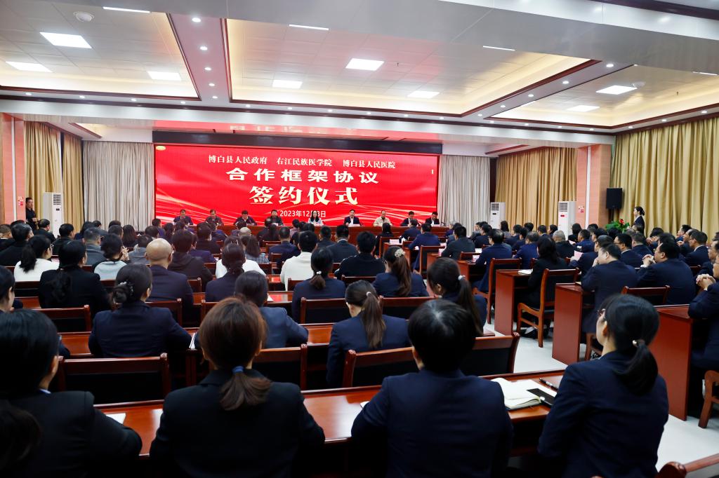 为加强我校与博白县人民政府的合作与交流,推动博白县医疗卫生健康事业的高质量发展。12月8日,必赢官网与博白县人民政府、博白县人民医院在博白县人民医院举行缔结教学医院、右江民族医院全人群健康促进与卫生政策研究博白中心、必赢242net官网公共卫生人才培养基地的签约和授牌仪式,学校党委书记邓砚,党委常委、副校长王俊利,玉林市卫生健康委四级调研员汤宏武,博白县委书记孙国梁,博白县委副书记、县长周印章,博白县人民政府副县长罗建勇,博白县人民医院党委副书记、院长彭瑜同志等领导出席会议,学校各有关部门、学院代表,玉林市、博白县相关部门负责人,博白县人民医院全体领导、各科室、教研室、实习生代表参加大会。此次大会由博白县县长周印章主持。