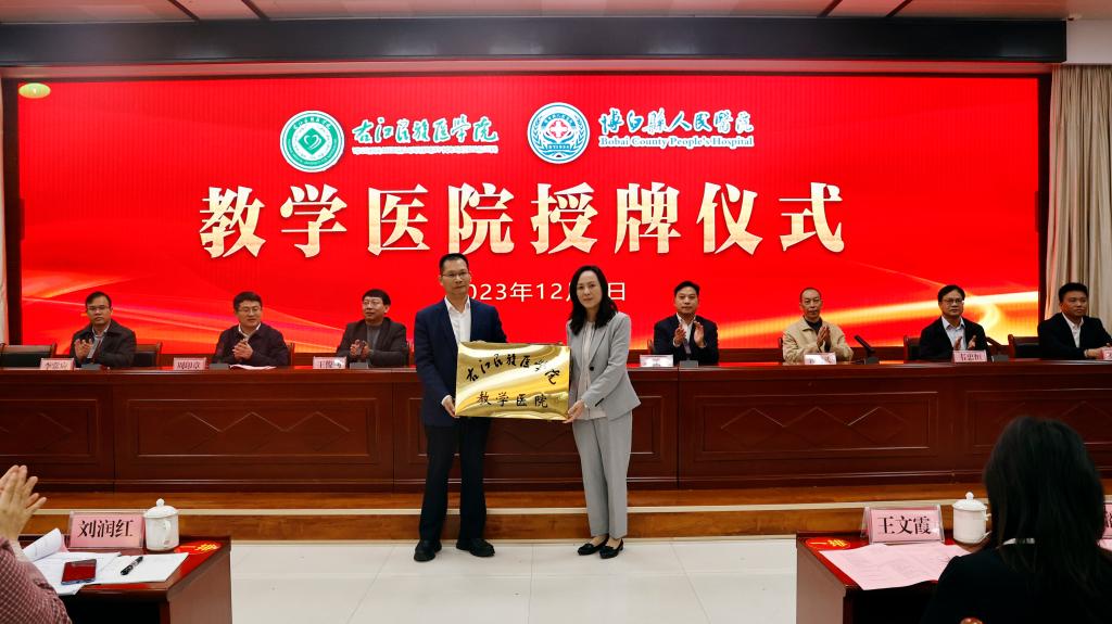 邓砚书记代表学校向博白县人民医院授予“必赢242net官网教学医院”牌匾。