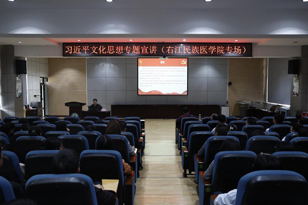 百色市委讲师团、习近平文化思想专题宣讲团成员、市委党史研究室(市地方志办)主任赵文刊以《学习贯彻习近平文化思想》为主题深入浅出的从“习近平文化思想的形成”、“全面领会习近平文化思想丰富内涵”、“贯彻习近平文化思想,推动百色宣传思想文化工作高质量发展”三个方面进行理论宣讲。他指出,习近平文化思想内涵丰富,思想深邃,博大精深,为我们在新时代新征程继续推动文化繁荣、建设文化强国、建设中华民族现代文明提供了强大思想武器和科学行动指南。就如何推动全市宣传思想文化工作高质量发展,他希望一要抓好百色理论武装工作,推动党的创新理论落地生根开花结果、推动党史学习教育常态化长效化、推动主题教育走深走实、改进理论宣传;二要抓好百色文化工作,要全力打造红色基因传承高地、红色文化旅游胜地和文化产业福地;三要抓好百色意识形态工作,要占领主阵地、打好主动仗、掌握主导权;四要抓好百色正面宣传工作,要全面宣传展示新时代百色新形象、推进媒体深度融合发展、加强对外宣传;五要抓好百色精神文明工作,要强化主流价值的主导地位、深入实施公民道德建设工程、积极开展文明创建活动、扎实推进乡风文明建设。