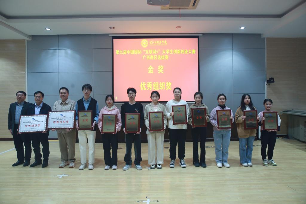 王俊利副校长为获得第九届中国国际“互联网+”大学生创新创业大赛广西赛区选拔赛金奖项目代表及优秀组织单位颁奖。