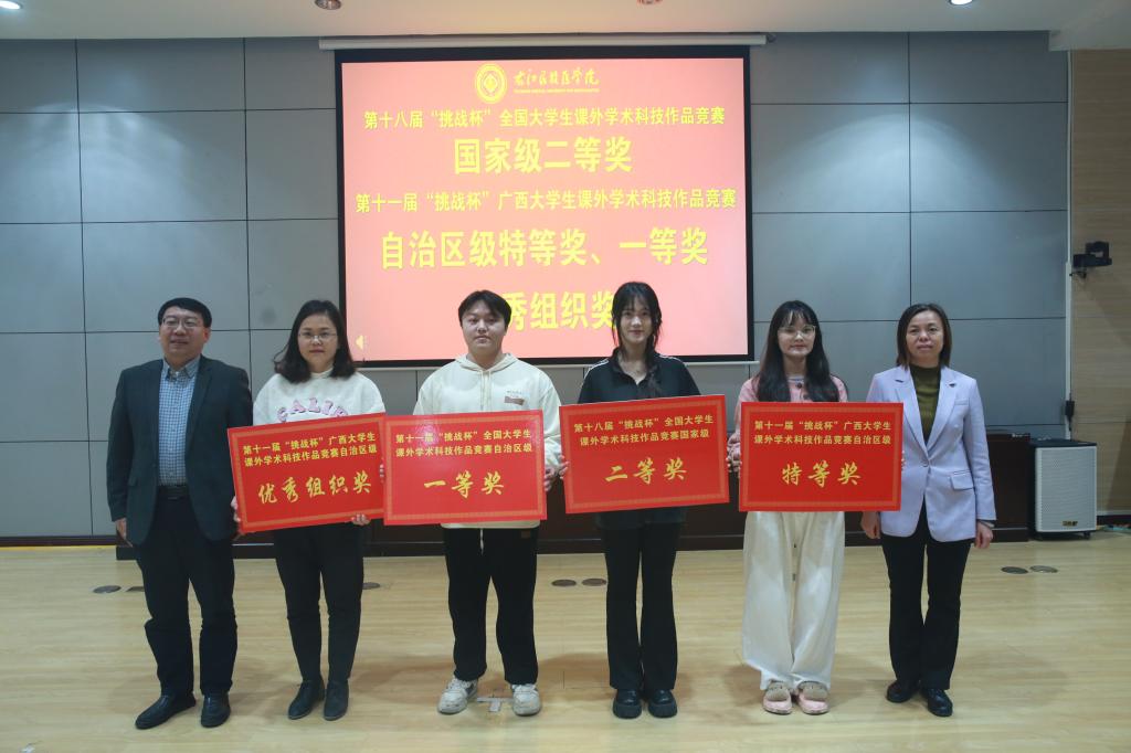 王俊利副校长、团委何彦妮副书记为获得第十八届“挑战杯”全国大学生课外学术科技作品竞赛国家级二等奖项目、第十一届“挑战杯”广西大学生课外学术科技作品竞赛特等奖、一等奖项目及第十一届“挑战杯”广西大学生课外学术科技作品竞赛优秀组织奖的组织单位颁奖。