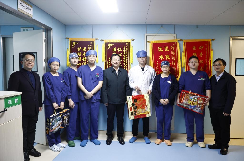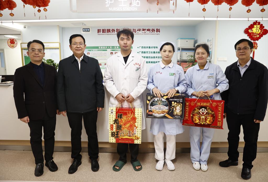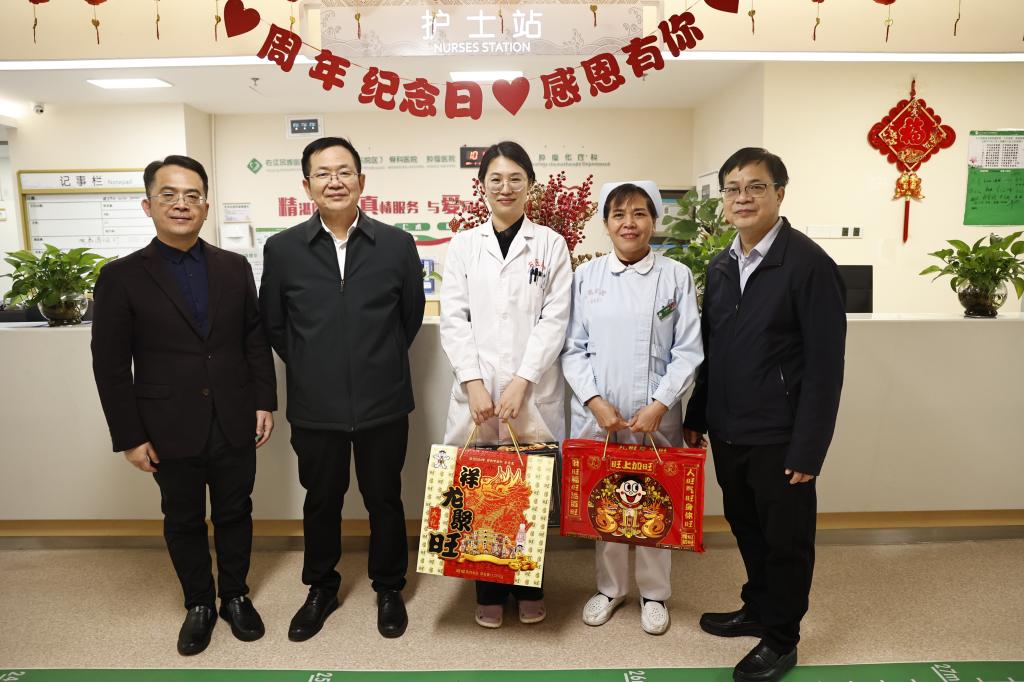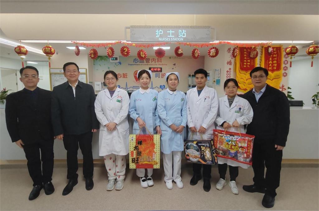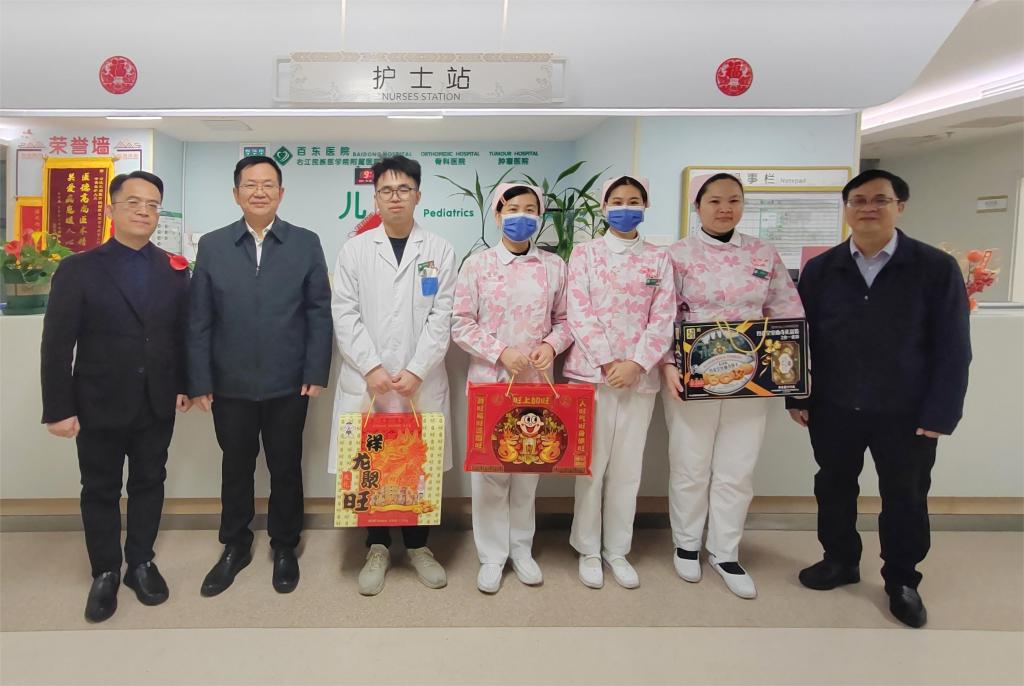 祥龙迎春,福满右医。2月10日,正值农历大年初一学校党委副书记、校长李雪斌代表学校看望慰问两校区和附属医院百东院区坚守岗位、辛勤工作的一线职工,为大家送上新春问候和诚挚祝福。院长办公室主任周岐江、临床医学院(附属医院)院长韦忠恒陪同慰问。