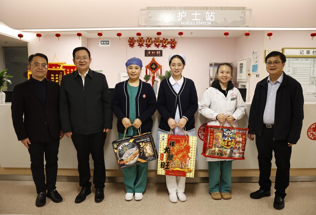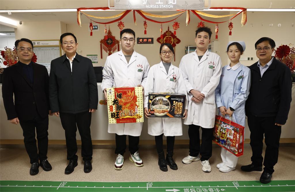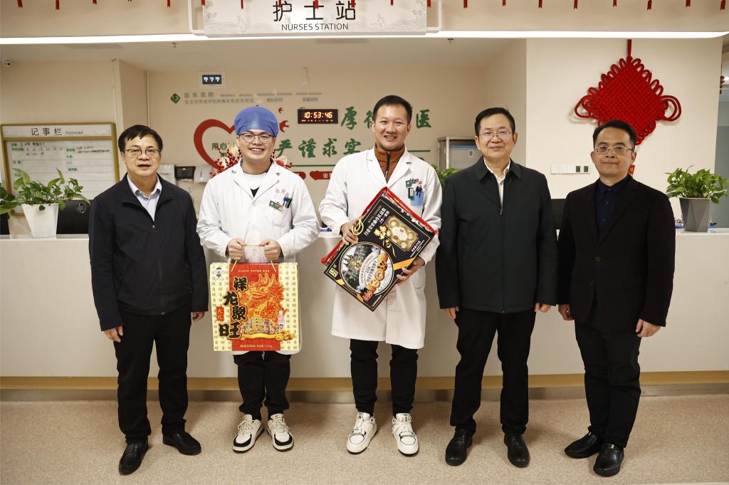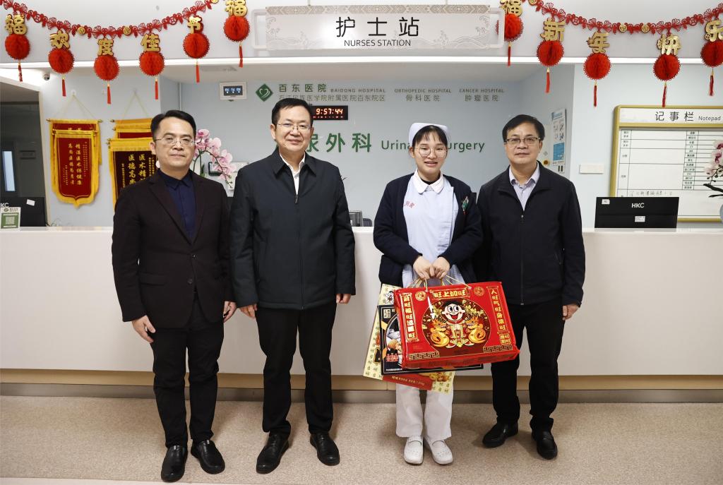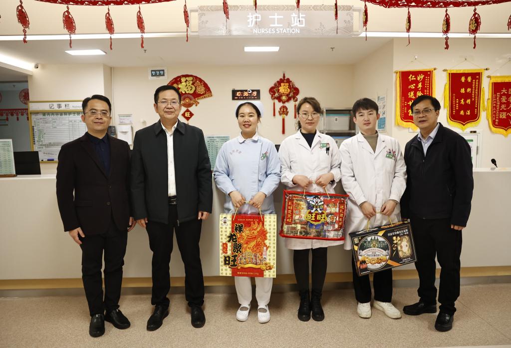 在附属医院百东院区,每到一个科室,李雪斌校长都与大家亲切握手详细询问他们春节期间值守安排、物资保障和家庭情况,叮嘱大家保重身体,并送上春节慰问礼包。新年快乐!”“春节期间同志们依然坚守岗位,大家辛苦了!”“祝大家身体安康、工作顺利,龙行龘龘、生活䲜䲜,龙年大吉!”一句句情暖人心的问候,一声声美好的祝福,带着浓浓的年味,温暖着每个人的心。