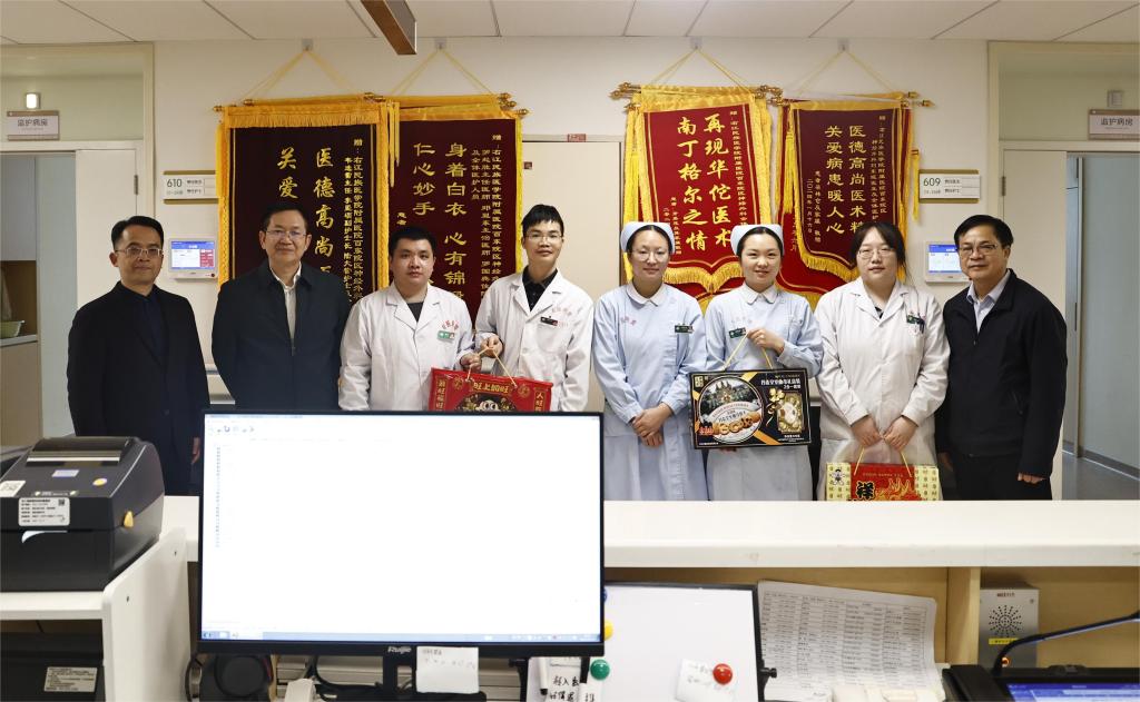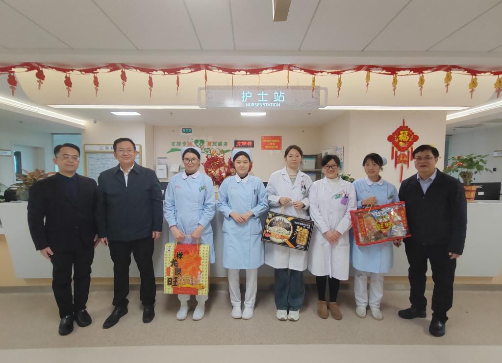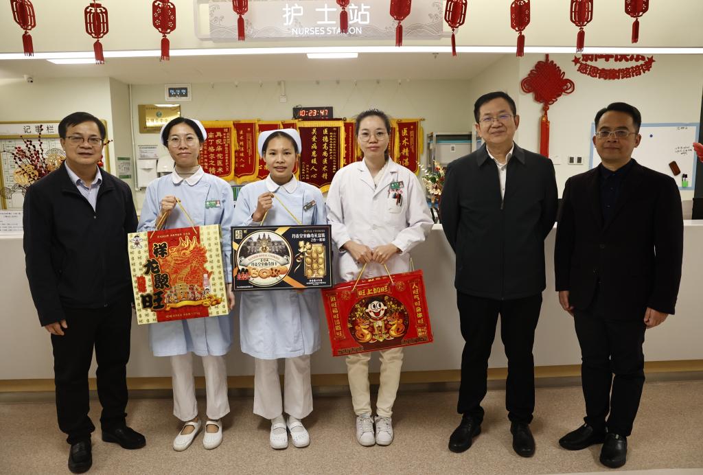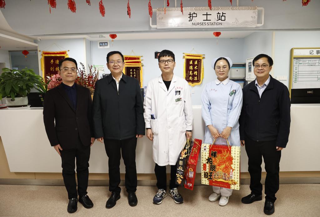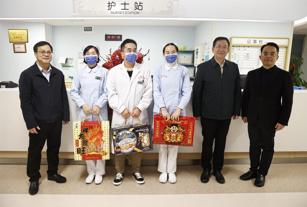 在附属医院百东院区,每到一个科室,李雪斌校长都与大家亲切握手详细询问他们春节期间值守安排、物资保障和家庭情况,叮嘱大家保重身体,并送上春节慰问礼包。新年快乐!”“春节期间同志们依然坚守岗位,大家辛苦了!”“祝大家身体安康、工作顺利,龙行龘龘、生活䲜䲜,龙年大吉!”一句句情暖人心的问候,一声声美好的祝福,带着浓浓的年味,温暖着每个人的心。