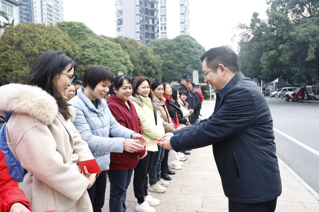 在百城校区和百东校区,一声声“新年好”的问候中,李雪斌校长与职工们亲切交谈,为他们送上新春的美好祝福和慰问金,对他们坚守工作岗位表示感谢,叮嘱他们要注意安全,安排好春节期间的工作和生活。李雪斌校长希望大家以龙腾虎跃的干劲闯劲,开拓创新、拼搏奉献,一如既往认真履行工作职责,以高度的责任感和使命感切实做好值班工作,确保各项工作正常运转,共同营造平安、欢乐、祥和的节日氛围。