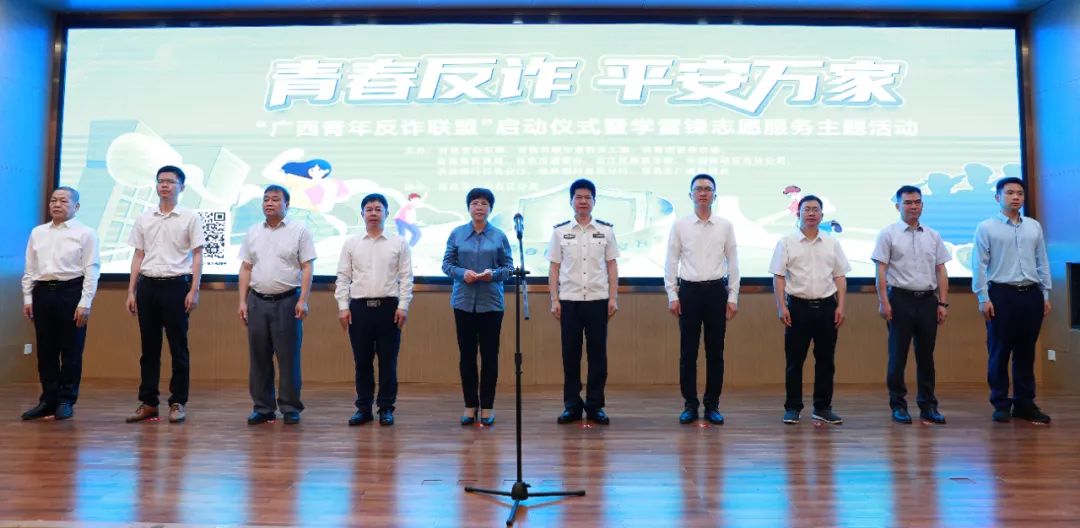 参会领导为“广西青年反诈联盟”青年志愿者授旗。