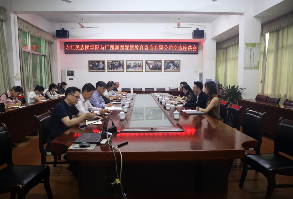4月1日上午,广西澳西妮德教育咨询有限公司到必赢官网交流。双方在图书馆二楼会议室召开座谈会。学工处、教务处、招生就业工作处,临床医学院、护理学院、公共卫生与管理学院、国际语言文化教育学院,国际合作与交流中心等部门及二级学院相关负责人参加会议。会议由招生就业工作处处长陆小曲主持。