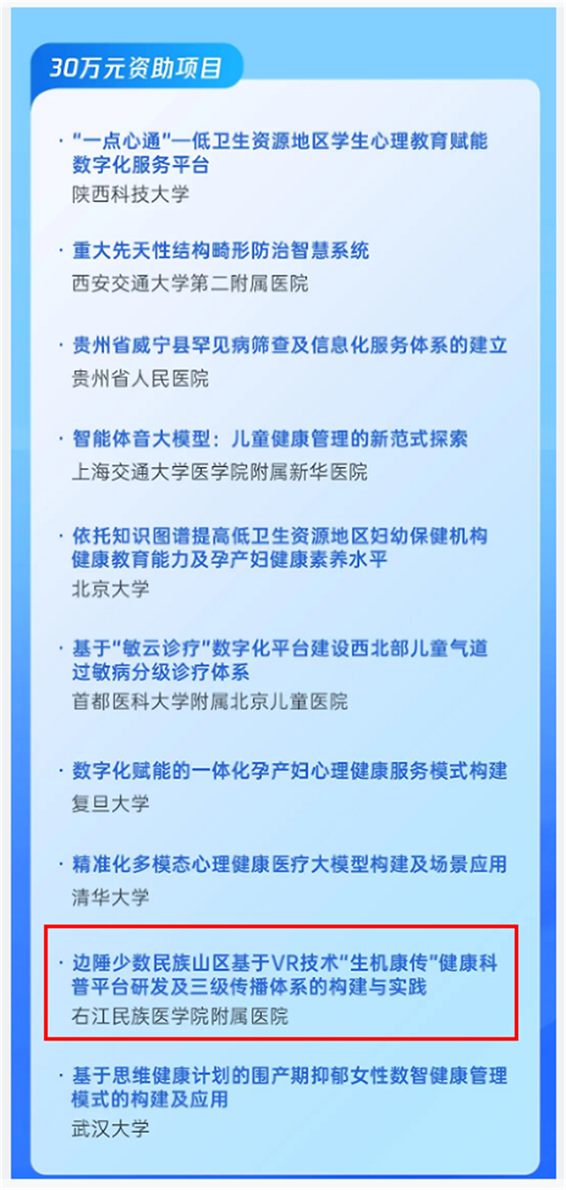 生机计划自2023年10月底启动以来,共收到来自全国29个省份的300个项目申请,并经过资质审核、初轮评选、尽职调查、终轮评选等四个环节后,于2024年3月27日在北京进行终审答辩。其中,右医附院护理部主任陆柳雪教授团队主持的《边陲少数民族山区基于VR技术‘生机康传'健康科普平台研发及三级传播体系的构建与实践》项目从全国300个申请项目中脱颖而出,成为有资质参与终评的43个项目之一。