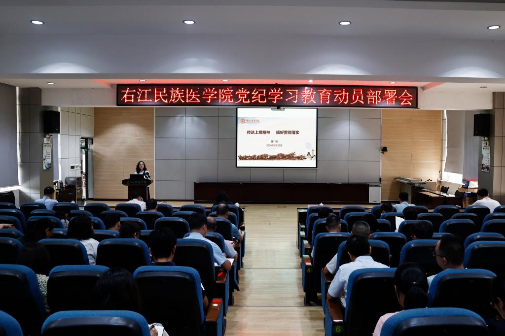 邓砚强调,要学深悟透重要决策部署,以高度的思想自觉深刻认识开展党纪学习教育的重要意义,更加坚定拥护“两个确立”,坚决做到“两个维护”。党纪学习教育是全面推动学校高质量发展的动力,是推动高水平大学建设、培养高质量“三得”人才的坚强保障。要锚定学习教育目标要求,以高度的政治自觉扛起学习教育的政治责任,坚决贯彻落实党中央决策部署和自治区党委工作要求。在学习贯彻《条例》上下功夫见成效,加强警示教育以案促学,抓好以训助学深化理解运用。要学纪知纪明纪守纪,以高度的行动自觉确保学习教育高标准高质量推进,取得实实在在的成效。压实领导责任,强化督促指导,注重宣传引导。以党纪学习教育为契机,推进新时代区域性高水平医科大学建设,为新时代壮美广西建设、中华民族伟大复兴贡献右医力量。
