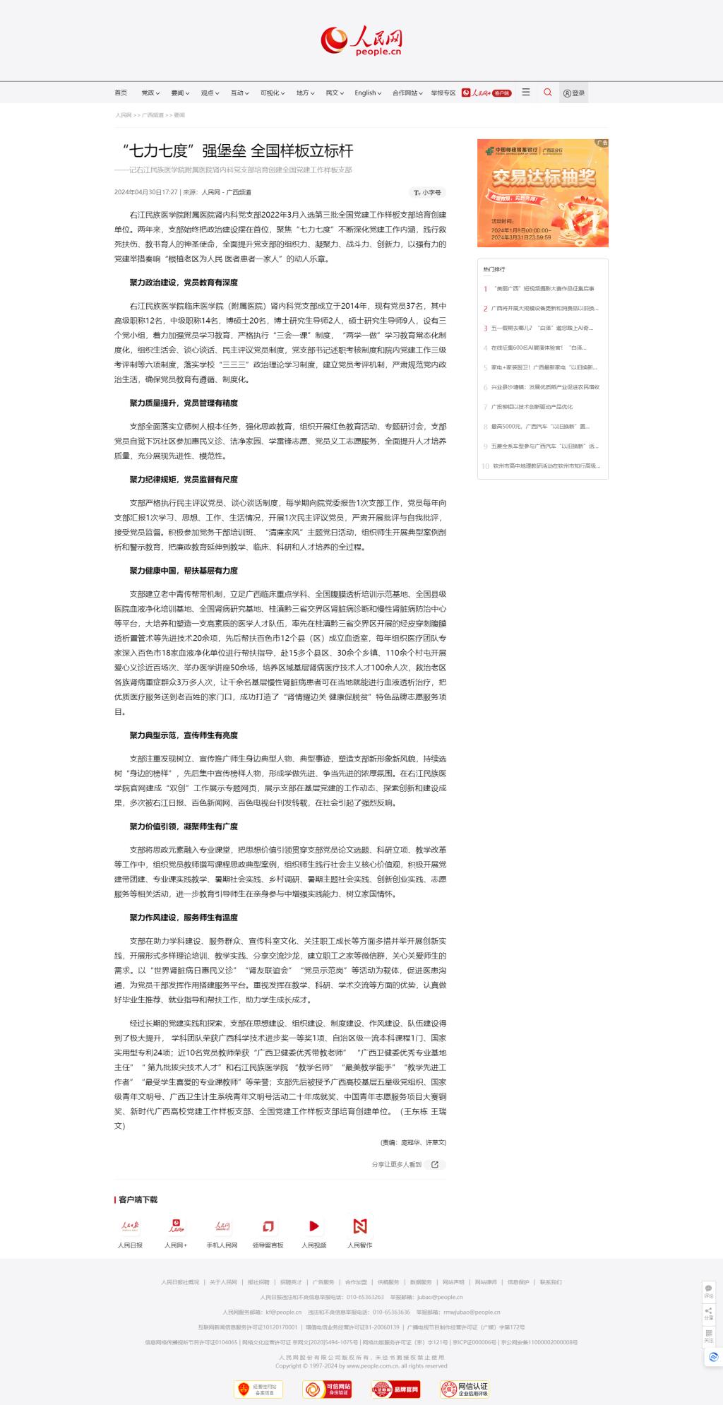 2024年4月30日,人民网刊发报道:“七力七度”强堡垒 全国样板立标杆——记必赢242net官网附属医院肾内科党支部培育创建全国党建工作样板支部。