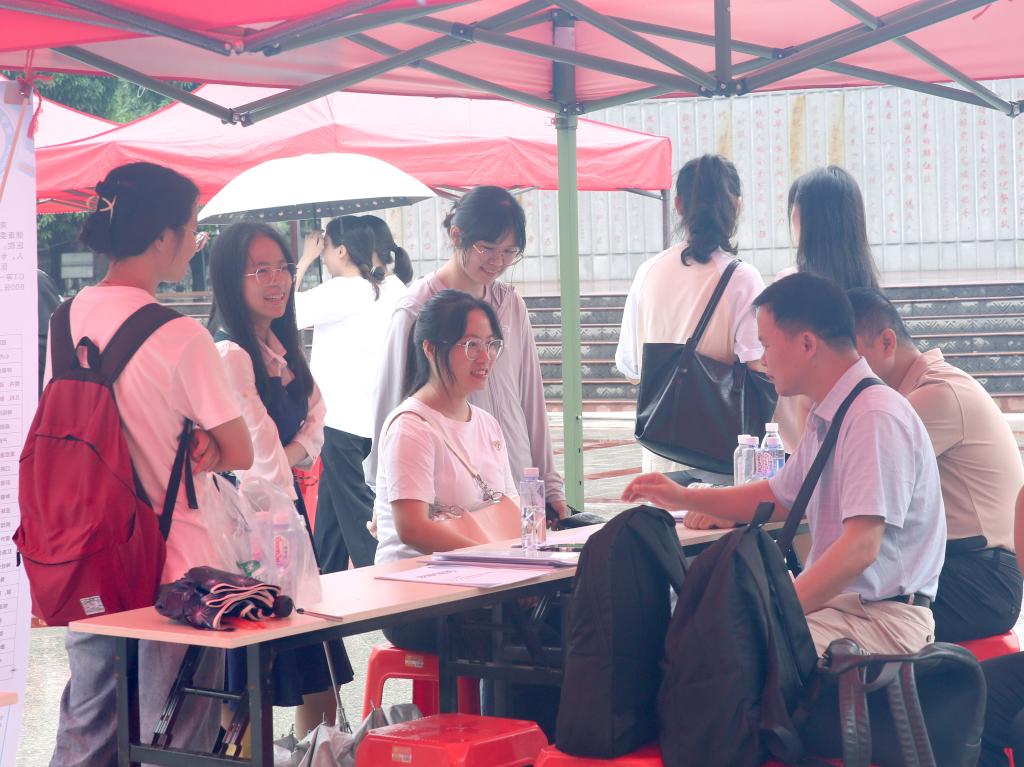 招聘会现场气氛热烈,招聘人员热情地接待每一位来咨询的毕业生,详细解答他们的疑问,毕业生们积极投递简历,与招聘人员了解岗位信息,交谈就业意向。