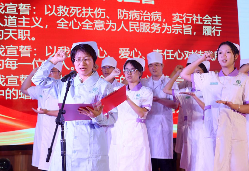 传承薪火之光,接力白衣之路,20位来自教学、科研、临床一线的资深护理前辈为新踏入护理事业的学子们戴上圣洁的燕帽,学子们接过前辈手中的蜡烛,从这一刻起,他们便化身为守护生命的白衣天使,用朴实而圣洁的形象诠释着职业的内涵,用青春和亮丽点燃那风中摇曳的生命之火。在护理学院党委副书记、院长张莉芳的带领下,全体护生举起右臂庄严宣誓,铮铮誓言代表着大家成为一名白衣天使的决心,势必将这份誓词铭记在心,用行动去践行。