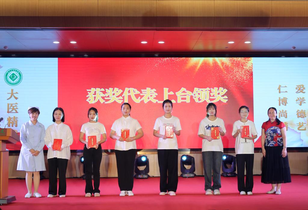 护理学院党委副书记黄上峰主持表彰环节,宣读2023年护理学院在党的建设、教育教学、专业建设、课程建设、学术科研等方面取得成绩,以及护理学院学生在大学生创新创业大赛、学生护理技能大赛、学生社会实践、院系年度优秀的集体奖和个人奖项,与会领导老师给教师、学生代表送花、颁奖祝贺。