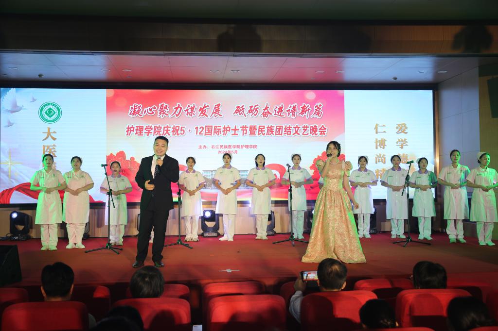 5月19日晚,护理学院举办2024年庆祝“5·12”国际护士节暨民族团结文艺晚会。图为朗诵《护士赞歌》。