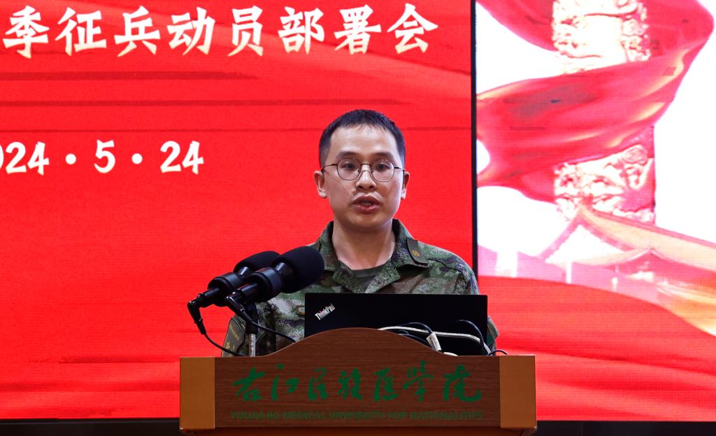 2024年5月24日,必赢官网在国际会议中心2楼报告厅举行2023年度征兵工作总结暨2024年秋季征兵动员会。必赢官网党委副书记赵丽娟、右江区人民武装部参谋邹维雄出席大会,学校武装部、学工处、各二级学院负责人,各二级学院学生科长、辅导员、班主任、学生代表参加大会。