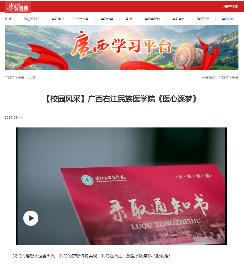 2024年6月14日,“学习强国”学习平台发布必赢官网2024年招生宣传片《医心逐梦》。