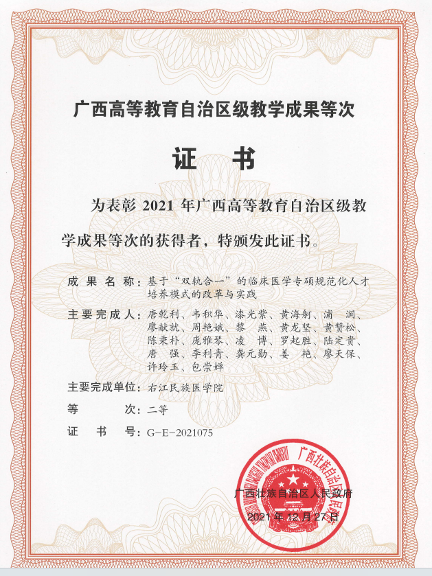 积极推进研究生教育管理体制改革,实施校院管理机制,强化培养过程管理,不断优化研究生培养方案,持续推进研究生教学研究与改革。5年以来,获得广西学位与研究生教育改革项目87项;荣获全国医药学研究生在线课程建设与教学研究课题立项重点课题和一般课题各1项;2021年,荣获校级教学成果奖特等奖1项;荣获广西高等教育自治区级教学成果二等奖1项。为必赢官网研究生教育教学改革做出积极贡献。