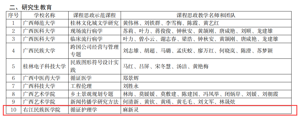 发挥思政课程思政育人主渠道作用,以省教育厅立项的研究生课程思政示范项目为契机,探索建立课程思政模式。近5年,荣获全区高校课程思政示范课程、课程思政教学名师和团队2项,荣获全区高校课程思政示范基层教学组织1项。