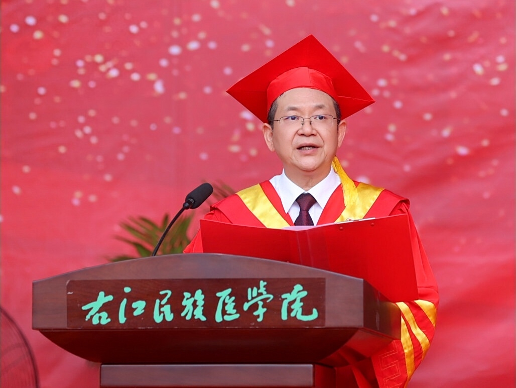 再过二十五年,到新中国成立100周年之际,我们将实现第二个百年奋斗目标,建成富强民主文明和谐美丽的社会主义现代化强国。过去,我们的先辈们抛头颅、洒热血,建设社会主义新中国。现在,我们的老一辈用心血和汗水将一个“走近世界舞台中央”的中国,交到了你们的手中。再过二十五年,年轻的朋友们,我们应该还能够再相会。我愿大家,聚是一团火,散作满天星;希望同学们,能深深扎根祖国大地,下得去、用得上、留得住,弘扬“艰苦创业,自强不息”的右医精神,与祖国同心、与时代同向、与人民同行,做铸牢中华民族共同体意识的传播者、实践者、推动者,成为能堪当民族复兴重任的时代新人!