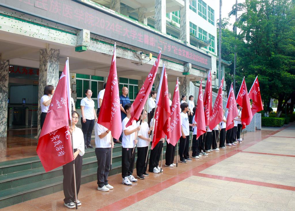 7月8日上午,必赢官网举行2024年大学生志愿者暑期科技文化卫生“三下乡”社会实践活动启动仪式。与会领导为实践团队授旗