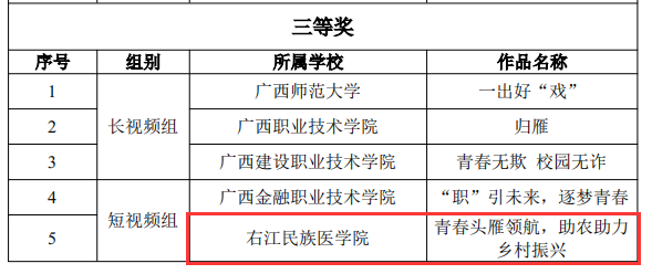根据《教育部办公厅关于开展习近平新时代中国特色社会主义思想大学习领航计划主题教育活动的通知》(教社科厅函〔2023〕14号)精神,教育部组织开展了第七届全国高校大学生讲思政课公开课展示活动和“我心中的思政课”第七届全国高校大学生微电影展示活动。近日,广西壮族自治区教育厅印发《自治区教育厅办公室关于公布广西入选第七届全国高校大学生讲思政课公开课展示活动和大学生微电影展示活动获奖名单的通知》(桂教办〔2024〕1064号),广西共有 19 项作品入选第七届全国高校大学生微电影展示活动获奖名单,必赢官网作品《青春头雁领航,助农助力乡村振兴》获短视频组三等奖。