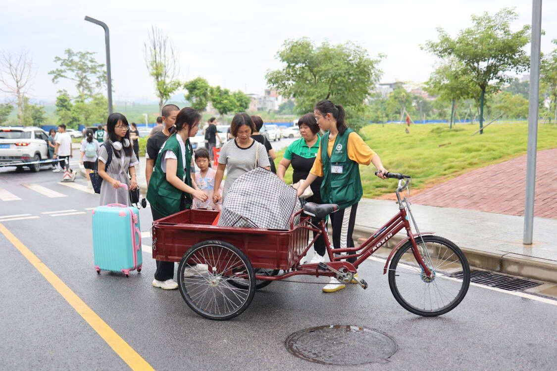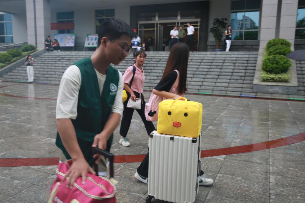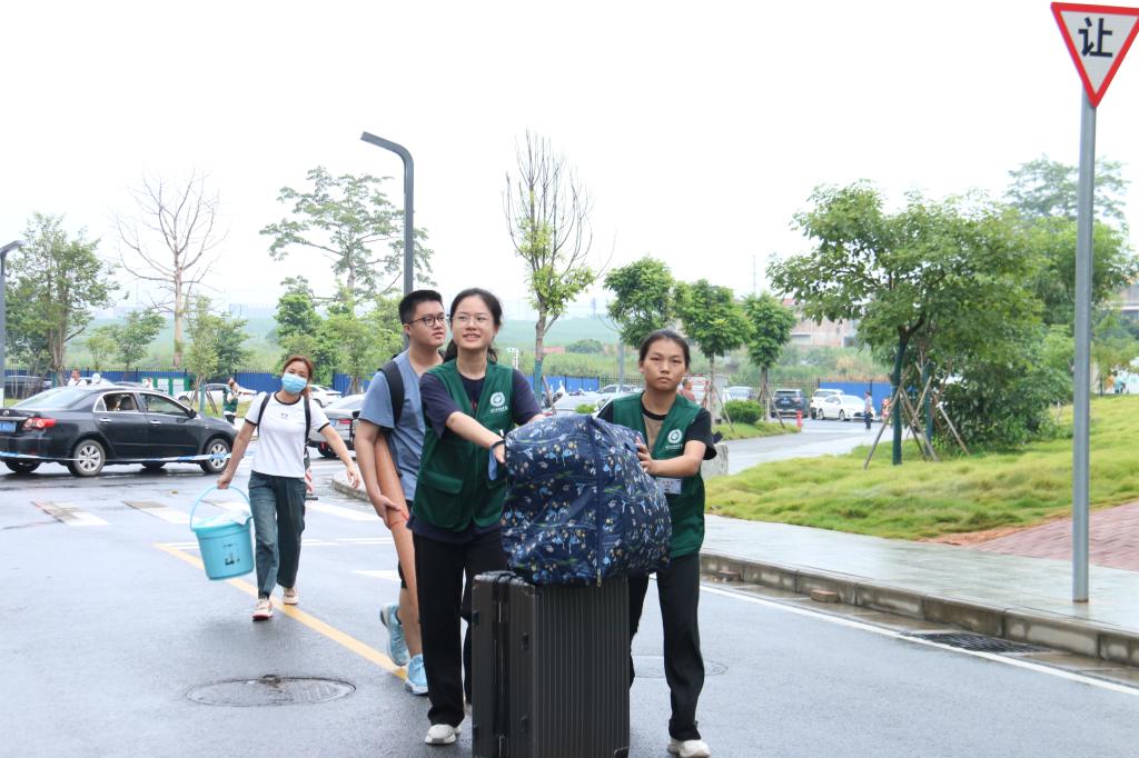 “你好同学,我来帮你拿行李!”“欢迎来到右医,我来给你撑伞,别淋着了。”“学弟学弟,请跟我往这边走,我带你去报到。”身穿统一“绿马甲”的志愿者们打破了新生初次见面的尴尬,他们有的为新生与家长撑伞护送,有的协助搬运行李,有的引导新生报到,一道道忙碌的身影成为校园中一道亮丽的风景线,让新生们的初到校园之旅既温馨又暖心。