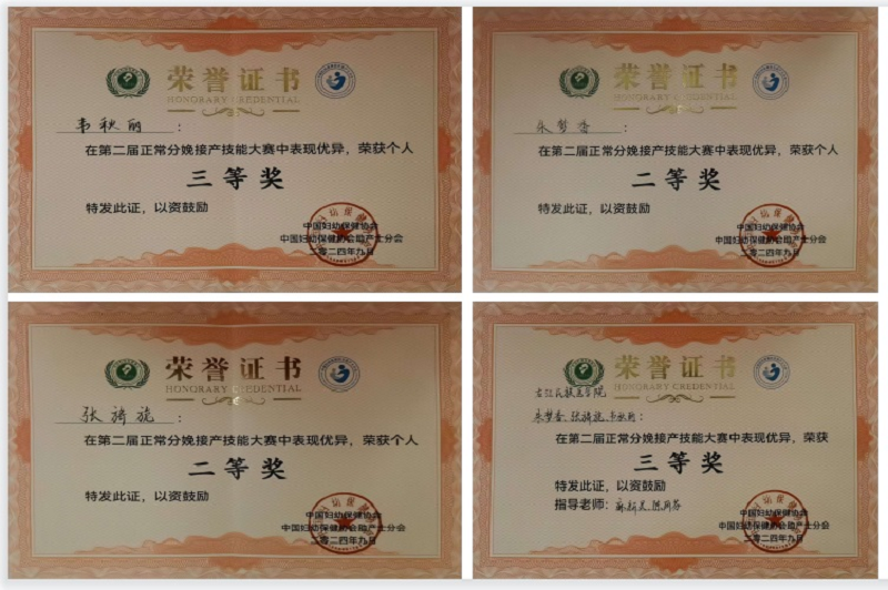 2024年9月3日至7日,由中国妇幼保健协会主办、助产士分会承办,苏州禧华妇产医院与江苏省妇幼保健协会助产士分会协办的第二届“正常分娩接产技能大赛”在江苏苏州顺利举行。护理学院2021级助产学本科朱梦香、张旖旎、韦秋丽三位同学代表学校参加了院校组比赛,并在众多参赛者中脱颖而出,取得了团体三等奖的良好成绩。其中朱梦香和张旖旎分别荣获个人单项二等奖,韦秋丽获得个人单项三等奖。