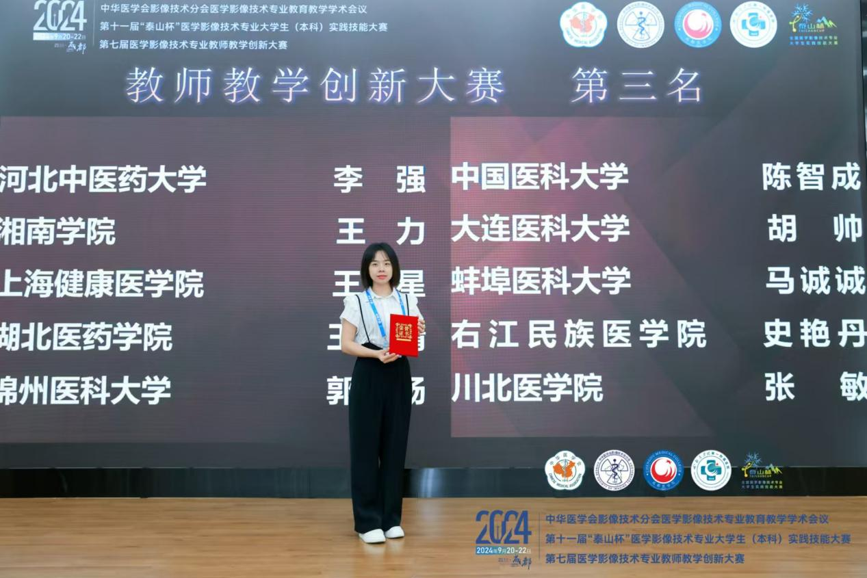 本次大赛分赛区全国共计60所高校参与,进入决赛的有36所高校,我院首次派出5名学生、1名教师参与。经主办单位评选,我院获得团体赛第三名,其中,华黎城获得医学影像技术基础理论第一名,谢荣锦获得DR检查技术第二名,雷新宇获得CT检查技术第三名,周翔宇获得MR检查技术第三名。史艳丹老师获得教师教学创新大赛第三名。