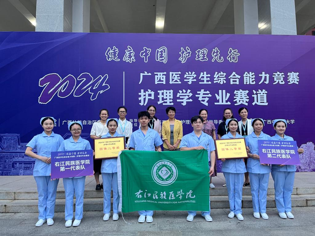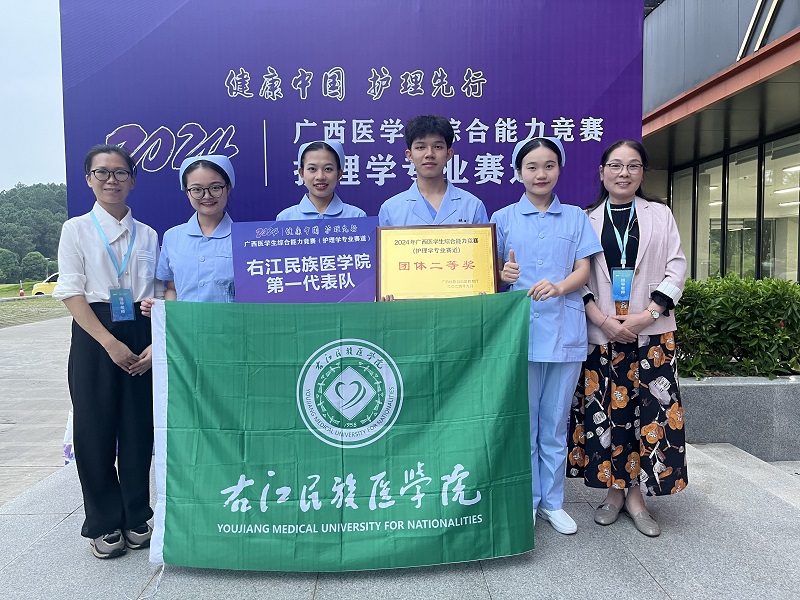2024年9月25日,在广西中医药大学举办的2024年广西高校大学生医学技术技能大赛(护理学专业赛道)中,必赢官网派出的两支代表队智勇双全、沉着应战、密切配合、奋力拼搏,均荣获团体二等奖。第一代表队由2021级护理学专业曾晓琦、卢迅、黄钰、覃政桂四位同学组成,选派沈艳清、黄宏、梁春荣、朱旺乔担任指导老师;第二代表队由2021级护理学专业麻霄霖、黄海叁、苏柯、黄思宇四位同学组成,选派陆青梅、赵丽红、李坚硕、陶嘉怡担任指导老师;本次参赛由护理学院院长张莉芳教授带队。