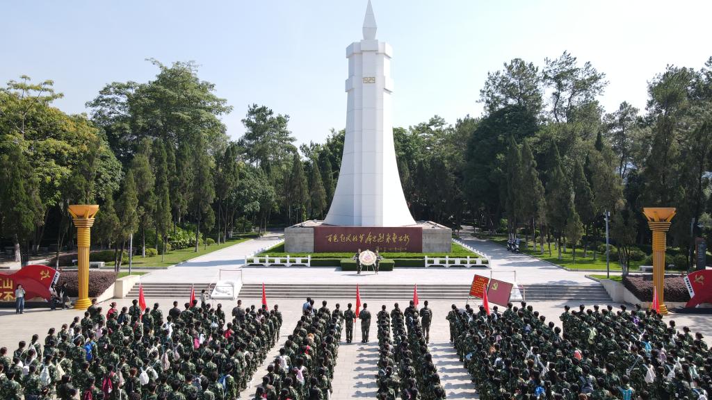 在百色起义革命烈士纪念碑广场上,百城校区拉练队伍还举行了庄重的向革命先烈敬献花篮仪式,师生们向纪念碑行注目礼,表达对革命先烈的深切缅怀和无限敬仰。