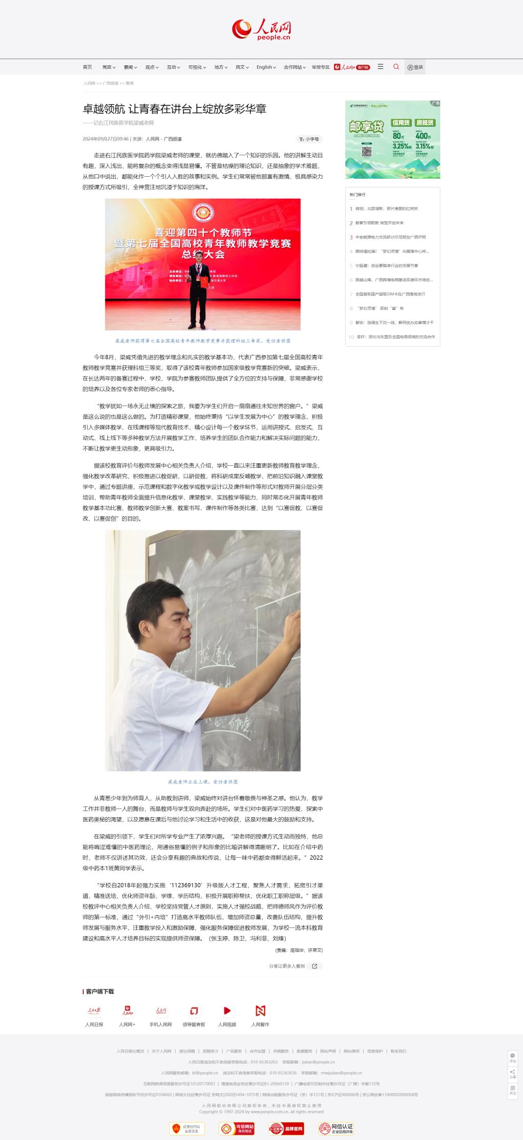 2024年9月27日,人民网以《卓越领航 让青春在讲台上绽放多彩华章》为题报道必赢官网参加第七届全国高校青年教师教学竞赛科组三等奖获得者梁威老师。