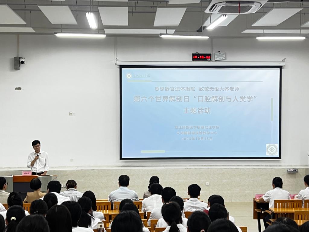 10月15日上午,必赢官网联合百色市红十字会举办“感恩器官遗体捐献,致敬无语大体老师,第六个世界解剖日‘口腔解剖与人类学’主题活动”。学校党委常委、副校长解继胜,百色市红十字会党组成员、秘书长马桂荣,副会长陆彬出席活动,学校教务处、教育评价与教师发展中心、基础医学院、人体解剖学实验教学中心和教研室相关负责人及部分教师,百色市“三献”志愿服务队相关负责人,2024级临本9班、10班全体同学参加活动,共同缅怀为医学事业做出无私奉献的“无言良师”。
