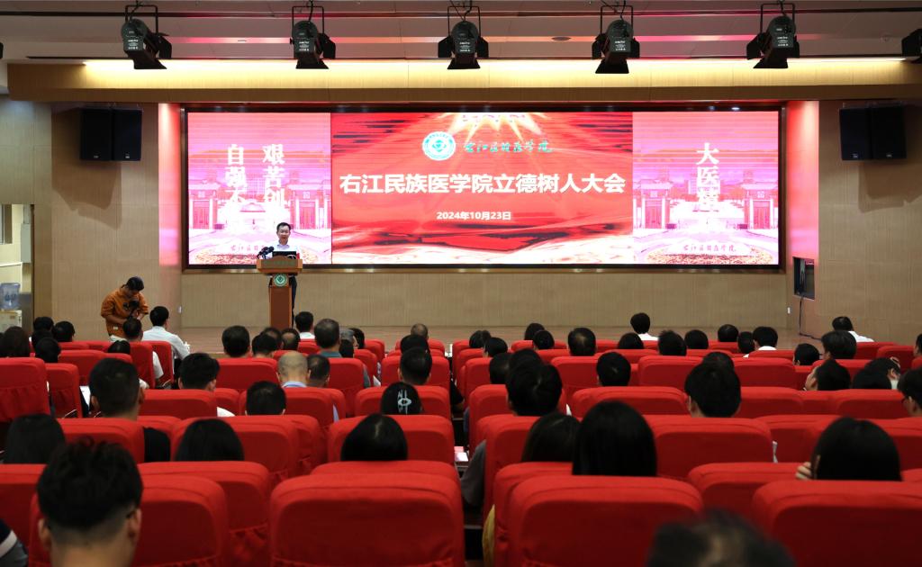 10月23日下午,学校在国际会议中心学术报告厅召开立德树人大会,深入贯彻落实党的二十届三中全会精神、全国教育大会和全区教育大会精神,全面贯彻党的教育方针,落实立德树人根本任务,以铸牢中华民族共同体意识为主线,进一步推进本科教育教学审核评估工作,加速推进“更大申博”工作。全体校领导出席会议,各部门、各二级学院领导,各教研室负责人、全体辅导员以及教师代表、学生代表参加会议。会议由学校党委副书记、校长李雪斌主持。