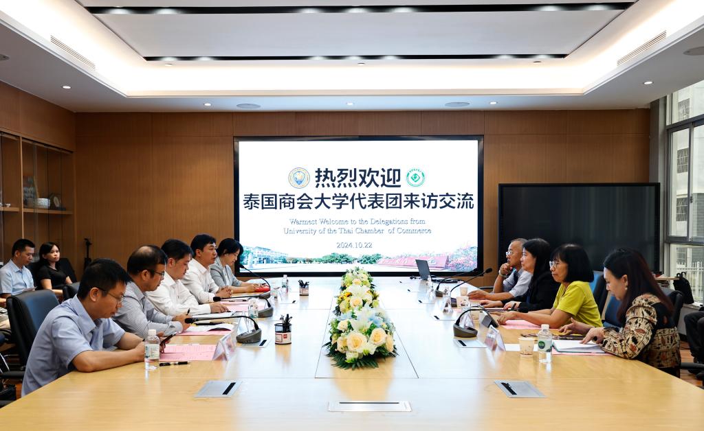 10月22日,泰国商会大学代表团一行莅临必赢官网开展访问交流活动。必赢官网党委常委、副校长黄龙坚,泰国商会大学代表团成员、人文与管理学院和国际合作与交流中心负责人参加交流会。见面会由国际合作与交流中心主任文建军主持。