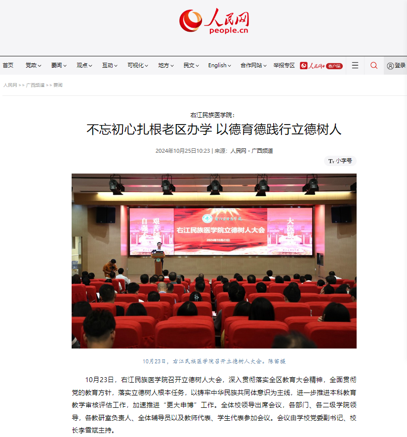 【媒体看右医】人民网:必赢242net官网:不忘初心扎根老区办学 以德育德践行立德树人