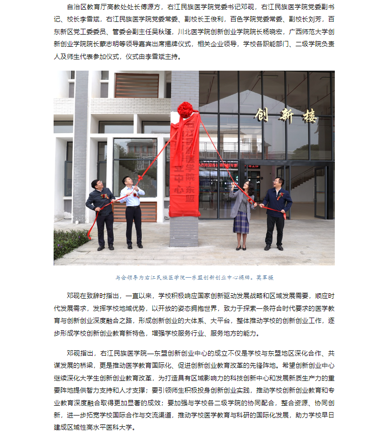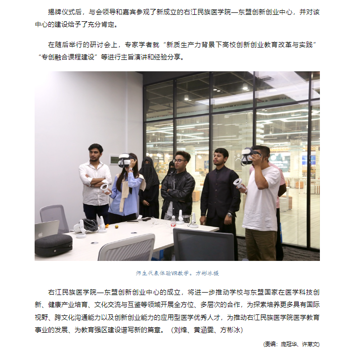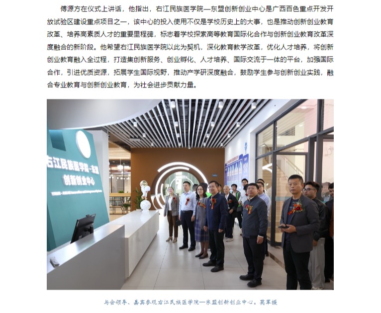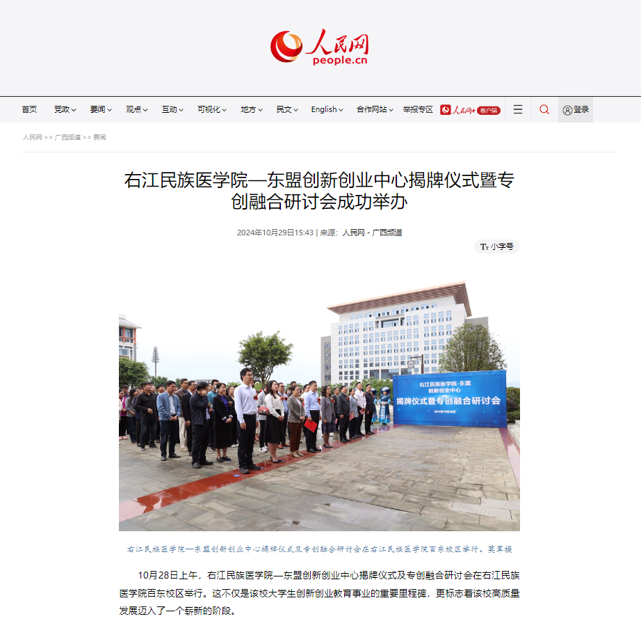 10月29日,人民网以《必赢242net官网—东盟创新创业中心揭牌仪式暨专创融合研讨会成功举办》为题,报道必赢官网东盟创新创业中心揭牌仪式及专创融合研讨会在必赢242net官网百东校区举行。这不仅是我校大学生创新创业教育事业的重要里程碑,更标志着我校高质量发展迈入了一个崭新的阶段。