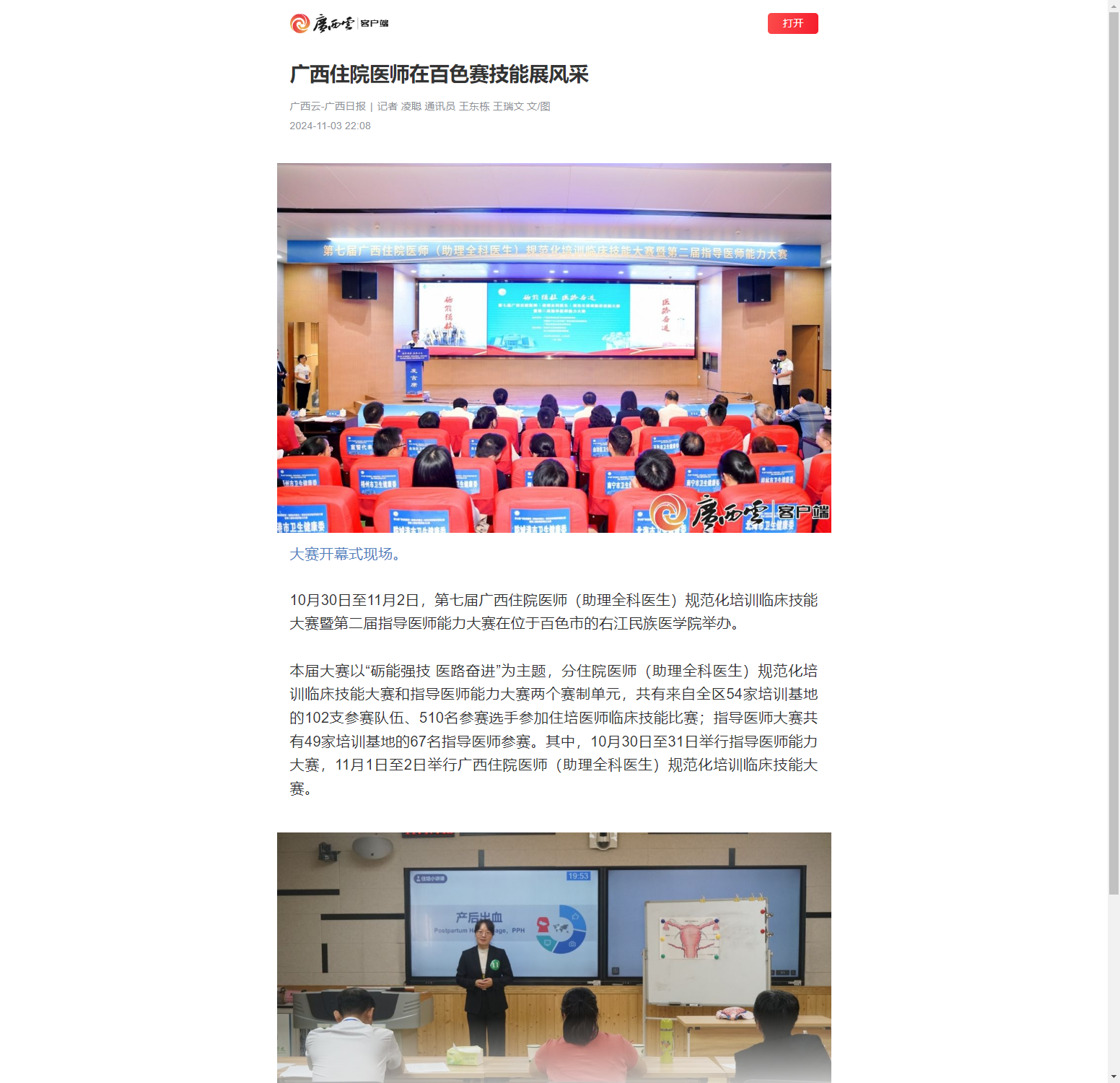 11月3日,广西云以《广西住院医师在百色赛技能展风采》为题,报道了由自治区卫生健康委、共青团广西区委、自治区妇联主办,百色市卫生健康委、必赢242net官网附属医院承办的第七届广西住院医师(助理全科医生)规范化培训临床技能大赛暨第二届指导医师能力大赛在必赢242net官网成功举办。