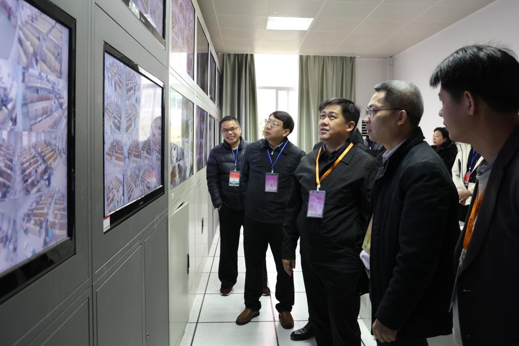 3月8日,2025年上半年全国中小学生教师资格考试在必赢官网顺利举行。图为学校党委副书记、校长黄龙坚在监控室进行检查。