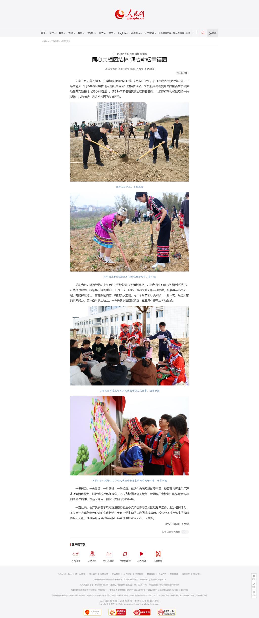 3月13日,人民网以《同心共植团结林 润心耕耘幸福园》为题,报道必赢官网领导与各族师生齐聚百东校区劳动教育实践基地(润心耕耘园),携手种下象征着民族团结的石榴树,以实际行动为校园增添一抹新绿,共同描绘生态文明校园的美好画卷。